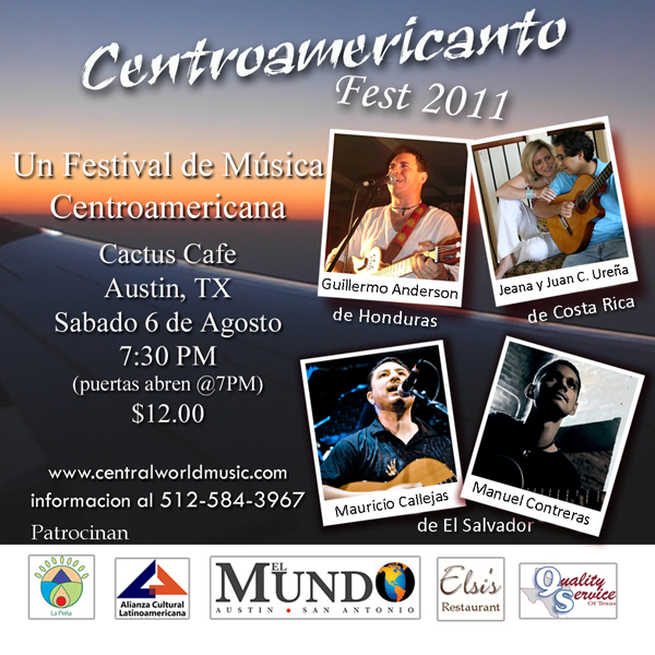 Centroamericanto Fest 2011 se realizará por primera vez en los Estados Unidos y reunirá a cuatro importantes cantautores Centroamericanos en un único concierto en el legendario Cactus Café de Austin TX. Se presentarán Guillermo Anderson de Honduras, Jeana y Juan Carlos Ureña de Costa Rica, Manuel Contreras de El Salvador y Mauricio Callejas de Austin.